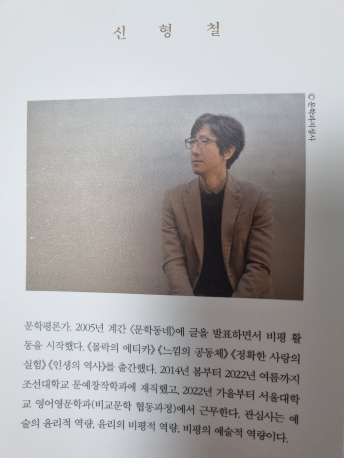 이 책은 문학평론가 신형철이란 사람의 책인데 그를 소개하는 책 겉장 이면에 쓰인 것을 읽으면 책 구성의 이유가 이해된다.