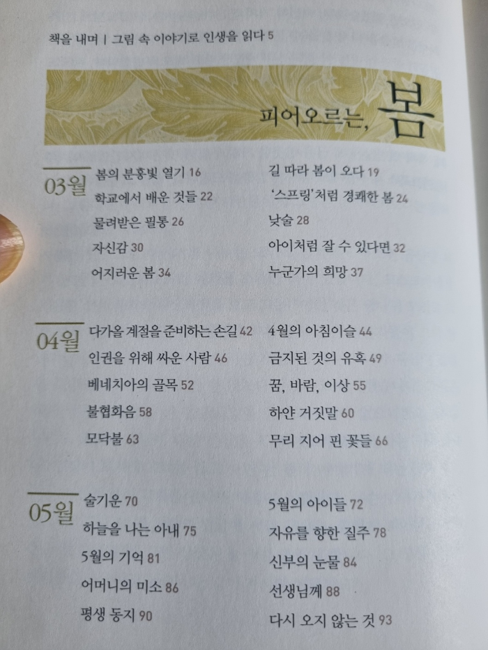 이 책의 구성은 이렇습니다. 봄부터 겨울까지 4계절을 순서로 하고 다시 계절별로 월별 10개의 그림과 그에 대한 선생님의 생각을 길지 않은(한쪽) 분량으로 정리해 주셨습니다.