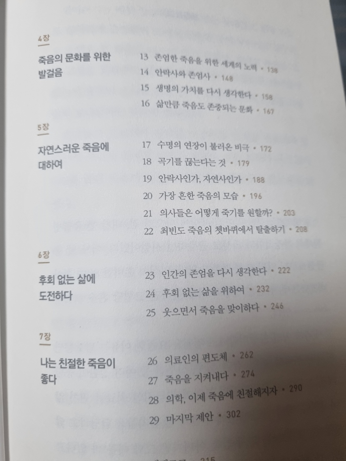 214쪽의 '내 죽음 미리 상상하기'에서 여러 목차들을 살피며 미리 한 번 임종 시 상황을 점검해 보는 것이 좋은 것 같습니다. 장수를 누린 스콧 니어링과 헬렌 니어링처럼 이런 자세로 자신의 죽음을 예견하고점검하는 개인, 그리고 존엄한 개인의 죽음을 위해 제도 개선을 위해 애쓰는 의료업계나 법조계사람들 제각각의 노력이 필요할 것 같습니다.