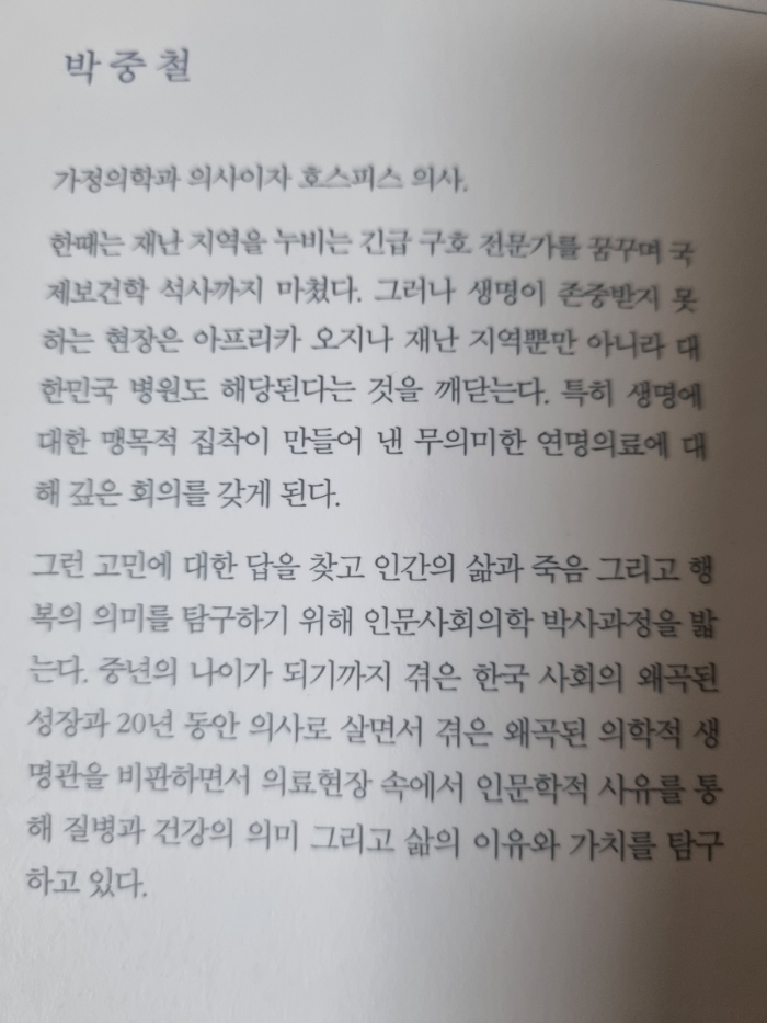 참 좋은 책을 만났습니다. 초고령화에 진입한 우리나라에서 어서 빨리 사회경제적 지원과 죽음에 대한 숭고한 논의가 활발하게 이루어지면 좋을 것 같습니다. 또다른 한편은 간호하는 가족의 고통을 사회가 같이해야한다는 것입니다.
