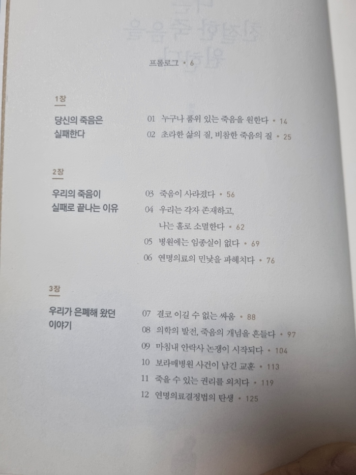 이 책의 요지는 이런것 같습니다. 연명치료 신중하자. 장례식장은 있으나 임종실이 없는 병원에서는 연명을 위한 과학기술의 쓰임만 고려될 뿐 존엄한 죽음을 위한 방이나 절차가 없습니다. 이를 고려하여 임종기간을 가정에서 적어도 병원의 임종실을 마련하고 이를 위한 제도 개선이나 법장치가 필요하다고 말합니다. 연명치료중단이 의료인이나 가족에게 윤리에 어긋나는 것이 아닌 ( 완치를 위한 노력보다)고통없이 남은 시간을 의미있게 보낼 수 있는 기회가 제공되어야 합니다. 이를 위한 대안으로 연명의료결정법은 적극적으로 호스피스 완화의료를 제안하고 그 확대를 촉진해야한다고 말하고 있습니다.