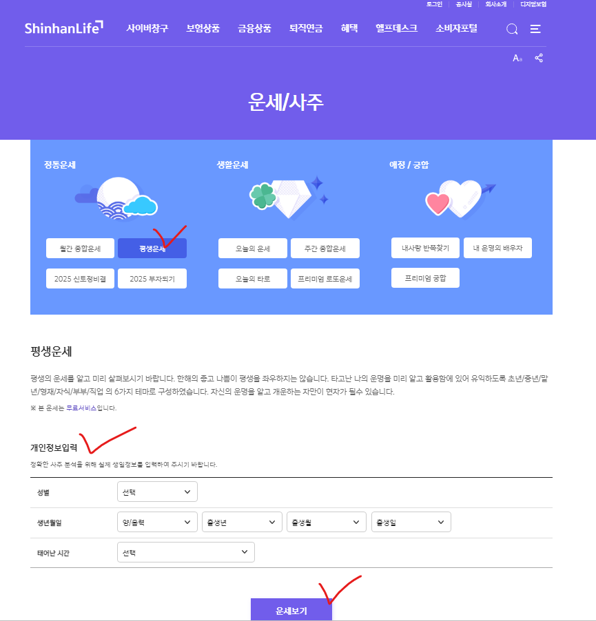붉은 색체크표시마다 클릭과 입력을 하고 운세보기를 누르면 됩니다.