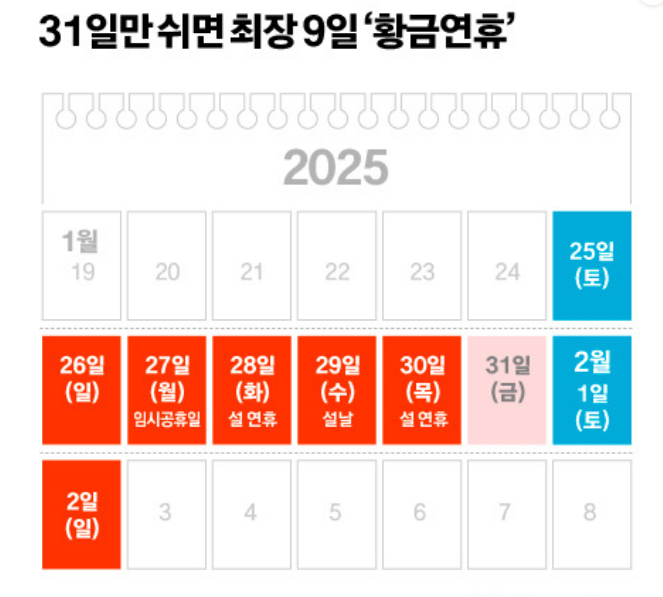 설이 얼마 남지 않았습니다. 설연휴를 사이에 두고 월요일 금요일을 두고 임시로 명절로 해야 한다는 의견이 많았습니다. 쉬다가 하루 나와서는 리듬이 깨져 일의 효율성이 없다는 이유와 쉬면서 국내 외식업이나 관광산업에 도움이 되어야 지금의 어려운 난국을 헤쳐나가는데 도움이 될 것이라는 의견이 많습니다. 최상목 권한대행등 국무위원들은 27일을 임시휴일로 지정했습니다. 이에 대해 차라리 31일을 휴일로 해야 시댁방문이나 차례준비에 바빴던 주부들의 휴식을 도울 수 있다는 김경수 전 지사의 의견도 있었습니다. 차라리 다 했으면 좋겠다는 생각이 들던차 오늘 기사가 눈에 보입니다.