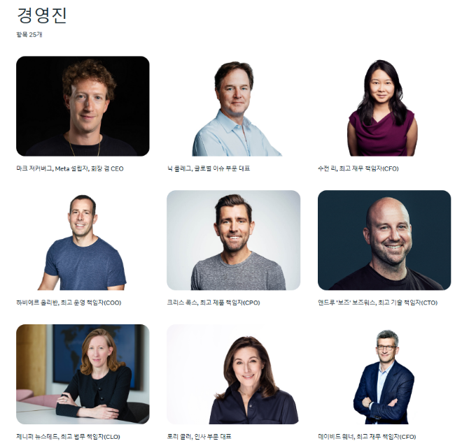 페이스북의 마크저커버그가 경영진의 제일 먼저 보입니다.