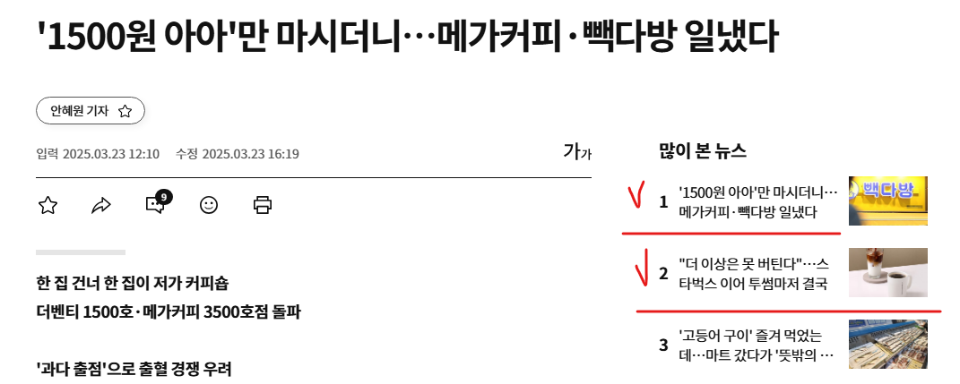 그런 커피 업계에 동시에 서로 상반되는 기사가 보입니다. 커피가격으로 인상이 불가피하다는 스타벅스와 투썸 기사가 오늘 아침에 눈에 띕니다. 그와 동시에 보이는 기사가 서로 상충하면서도 구독순위 1,2위를 보여줍니다.