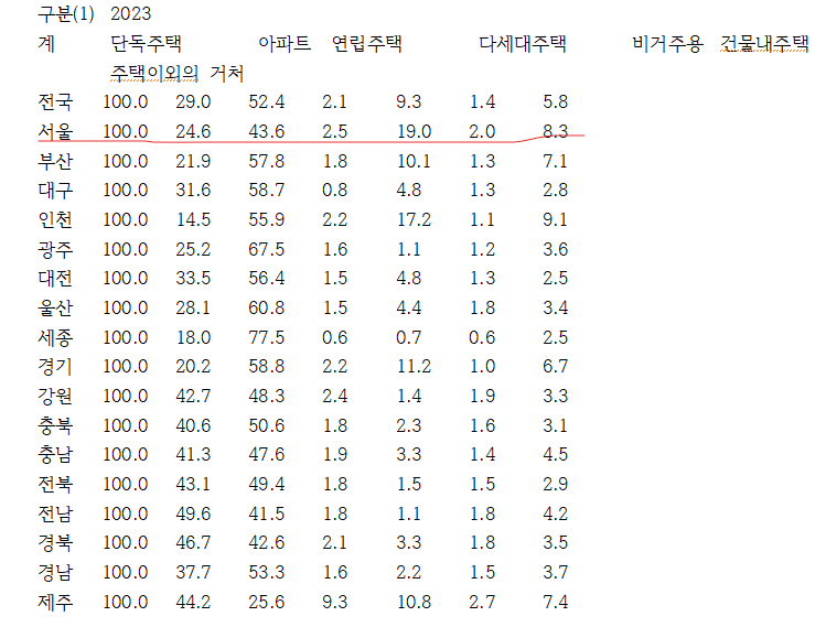 이러한 통계들은 대한민국이 여전히 '아파트 공화국'이라 불릴 만큼 아파트 중심의 주거 문화가 지속되고 있음을 보여줍니다. 다만, 최근의 부동산 시장 변화와 주택 공급 정책 등에 따라 이 비율은 향후 변동될 가능성이 있습니다.