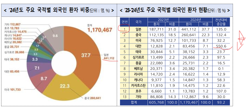 이전에 우리나라 정책관료는 2070년까지 70만명의 의료관광객 유치를 예상한다고 말한 적이 있습니다. 그런데 작년 2024년까지 70만 명이 아닌 2023년의 두 배에 가까운 117만 명의 관광객을 유치한 것입니다.