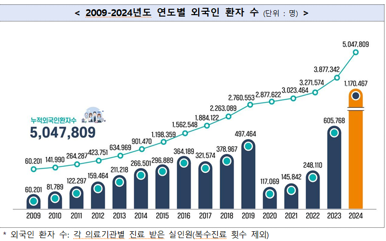 코로나 시기 꺾였던 외국인 환자의 수가 작년 2024년 (주황색) 놀랍게 성장한 것을 표로 확인할 수 있습니다.