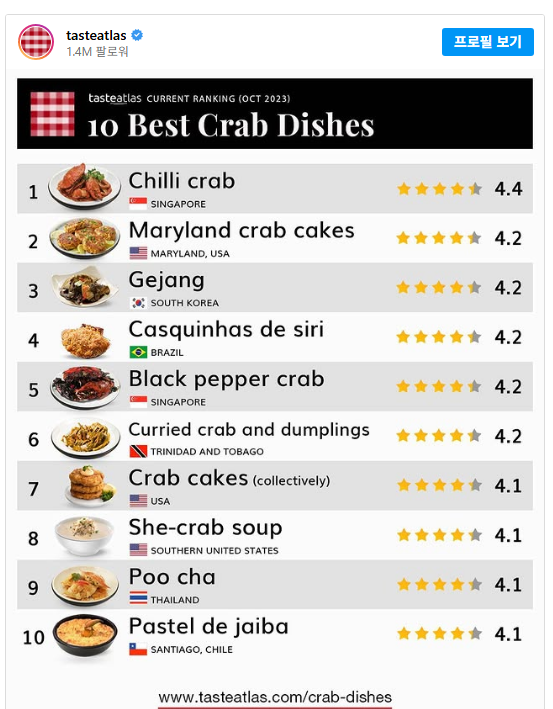 싱거폴을 거점으로 둔 HYPEBEAST에서 발표한 자료에 따르면 우리나라 간장게장은 세계의 가장 맛있는 게요리에서 3위를 차지했다는 사실을 알수 있습니다. 이 순위를 매긴 것은 테이스트 아틀라스라는 단체이고 이 내용을 실은 곳이 HYPEBEAST입니다.