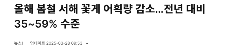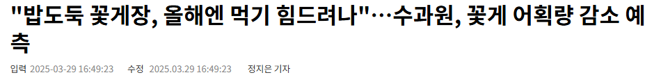 2025년 연초부터 봄에 잘 보이는 꽃게가 매우 귀하다는 기사가 자주 보입니다. 아래는 다양한 언론사 기사의 제목만을 캡처해 본 것들입니다. 5월 8일 날짜로 그 이전의 기사보다 절망적인 '90퍼센트 급감' 말하는 기사를 맨 먼저 실어보았습니다. 좋아하는 음식 셋을 고르라고 했을 때 간장게장을 1,2순위로 뽑았던 사람이라 관심을 가져본 내용입니다.