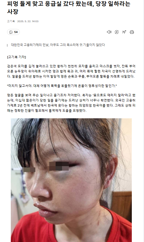 많이 접했던 외국인 노동자에 관한 마음 아픈 기사입니다.