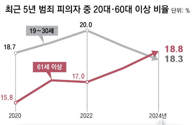 그런데 이렇게 60대의 범죄 피의자가 20대를 추월하며 큰 비중을 차지하게되엇다는 기사까지! 그래서 정리해보았습니다.