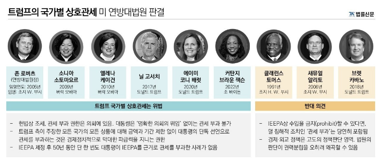 지난달 자신의 소셜미디어(SNS) 트루스 소셜에 "우리는 관세로 6000억 달러 이상을 거둬들였고 앞으로 더 거둘 것"이라며 정책 성과를 과시해 왔던 트럼프대통령이 자신의 정책을 수정해야하는 상황에 직면했다. "대법원에서 미국에 불리한 판결이 나온다면 우리는 끝장(screwed)이다"라며 재판부를 압박하기도 했었으나 먹히지는 않은 것입니다.