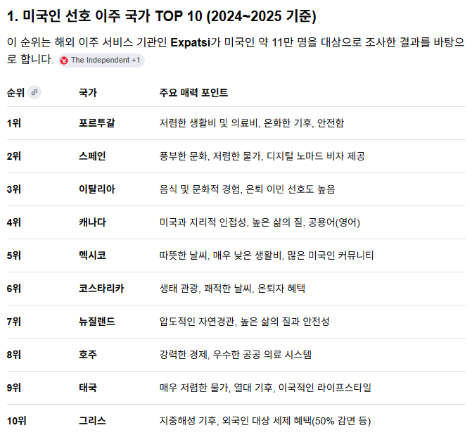 1. 유럽 선호 현상: 미국인들은 전통적으로 인접한 캐나다나 멕시코를 선호했으나, 최근에는 삶의 질과 저렴한 물가를 동시에 잡을 수 있는 유럽(포르투갈, 스페인 등)으로 관심이 크게 쏠리고 있습니다.