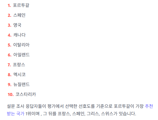 그러나, ㅎㅎㅎ 실제 이민을 실행할 때는 언어 장벽, 보수적인 직장 문화, 비자 취득의 어려움이 큰 걸림돌이 됩니다. 그래서 비자 대행사나 실제 이민자 통계에서는 포르투갈이나 멕시코 같은 '현실적인' 국가들이 더 높게 나타나게 됩니다.