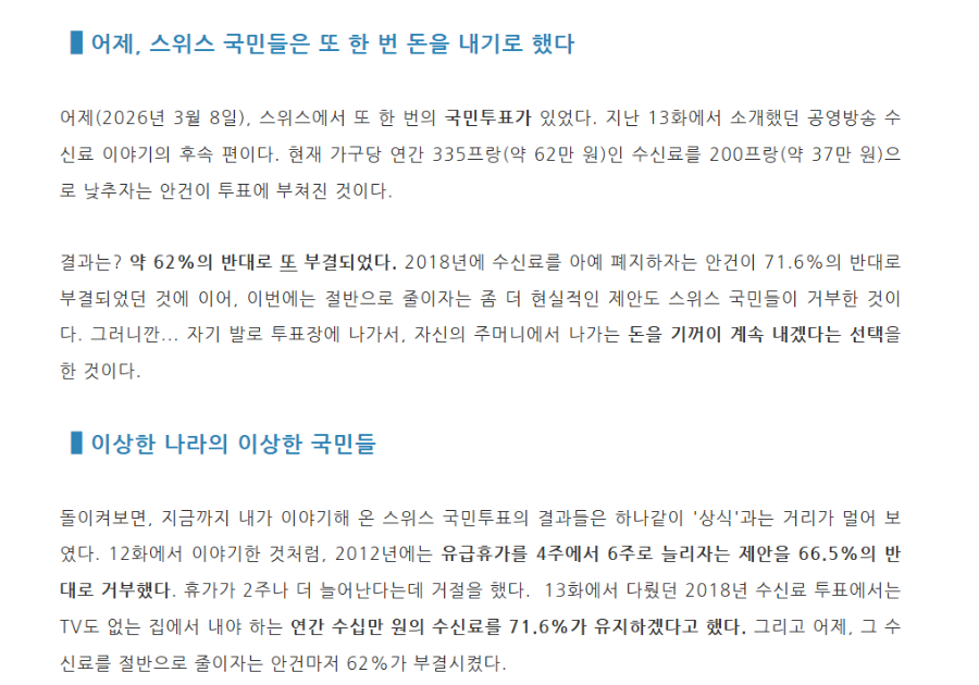 위기 때마다 빛나는 스위스 프랑 | ▐ 어제, 스위스 국민들은 또 한 번 돈을 내기로 했다 어제(2026년 3월 8일), 스위스에서 또 한 번의 국민투표가 있었다. 지난 13화에서 소개했던 공영방송 수신